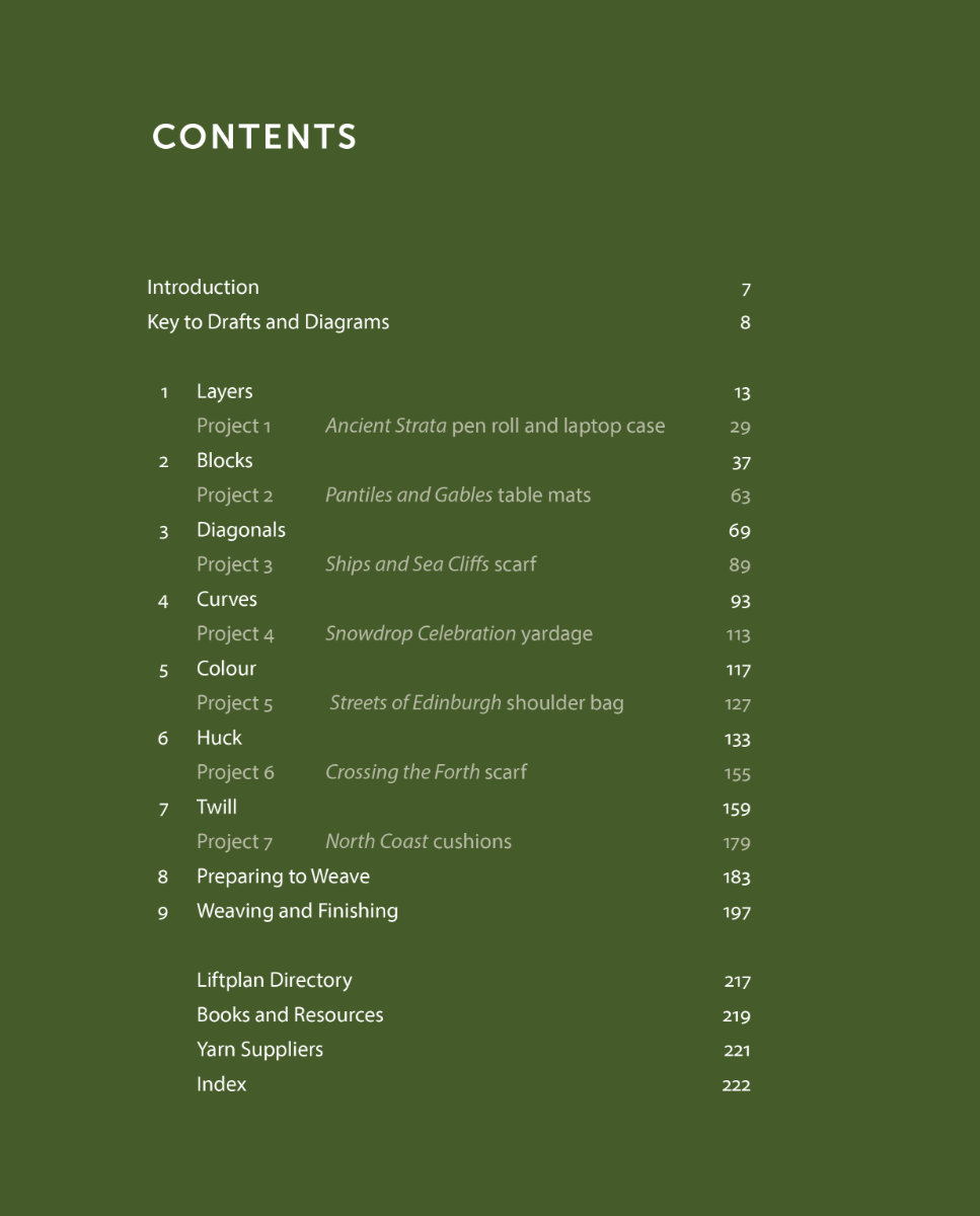 There are nine chapters in total and the first seven are organised by design element. That is, each chapter introduces a new design element to incorporate into your double cloth repertoire. At the end of each chapter I’ve created a project which puts that element to work using inspiration drawn from the landscape of Scotland.