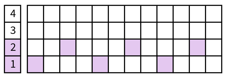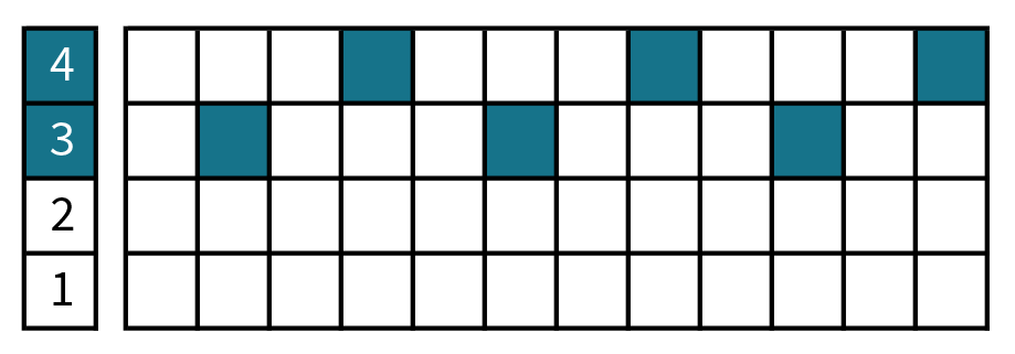 This threading is simply a straight draw, with one layer threaded on the odd-numbered shafts (1 and 3) and the other on the even-numbered shafts (2 and 4). For this reason, I tend to characterise this approach as odds versus evens, and I usually think of the layer on the odd shafts as ‘layer one’ while the other layer is ‘layer two’. The threading draft looks like this: