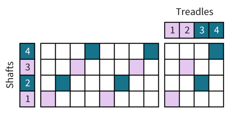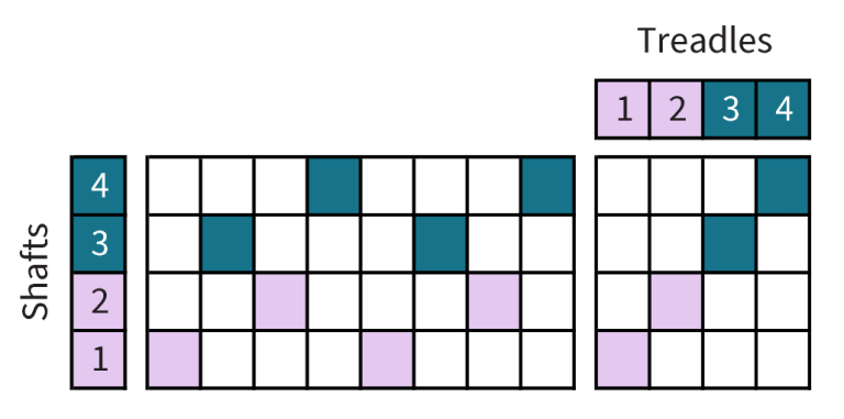 The draft on the left shows the parallel threading and a corresponding four-treadle tie-up; the draft on the right uses the straight threading. I have coloured in the squares which indicate where a shaft is tied to a treadle. The shaft assignment is different, but once the tie-up is made they are functionally interchangeable. We can use exactly the same treadlings for either option.