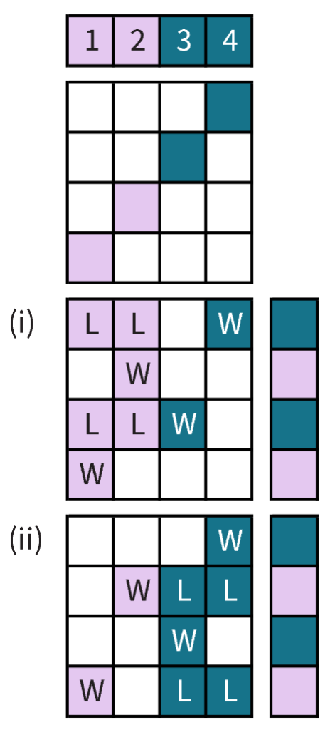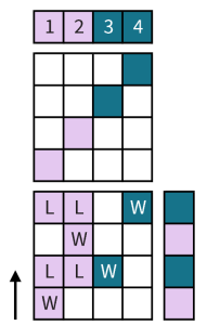Every row in these treadlings contains both a W and an L, since a weaving treadle and a layer-manoeuvring treadle are needed for every pick.