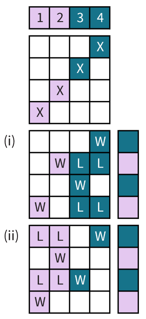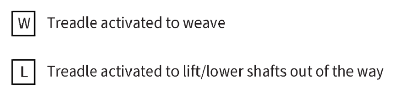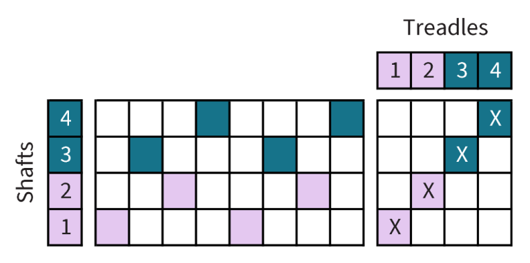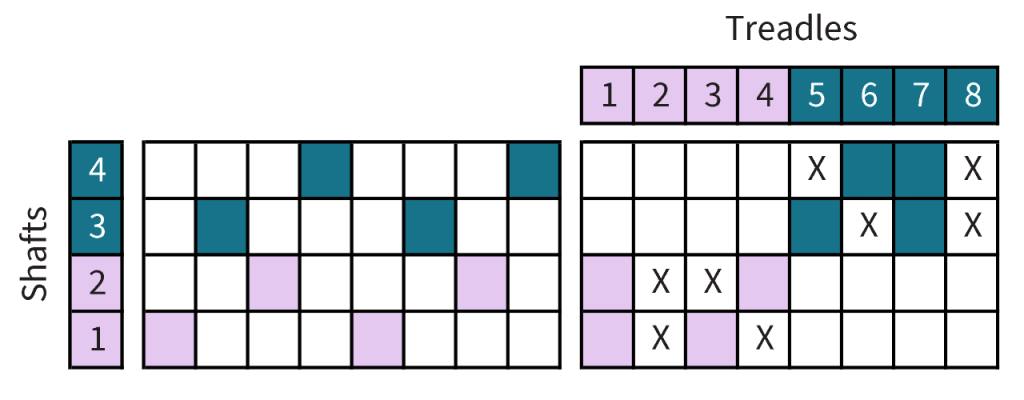 As above, I have coloured in some of the squares: these indicate which shafts are tied up to rise. Shafts which are tied up to sink are marked with an X on a white ground. So both treadles 1 and 2 are tied up to shafts 1 and 2, but treadle 1 will raise both shafts while treadle 2 will lower both shafts. Treadle 3 will raise shaft 1 and lower shaft 2, while treadle 4 does the opposite: it will lower shaft 1 and raise shaft 2.