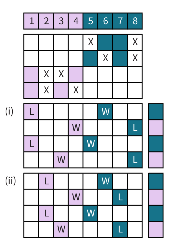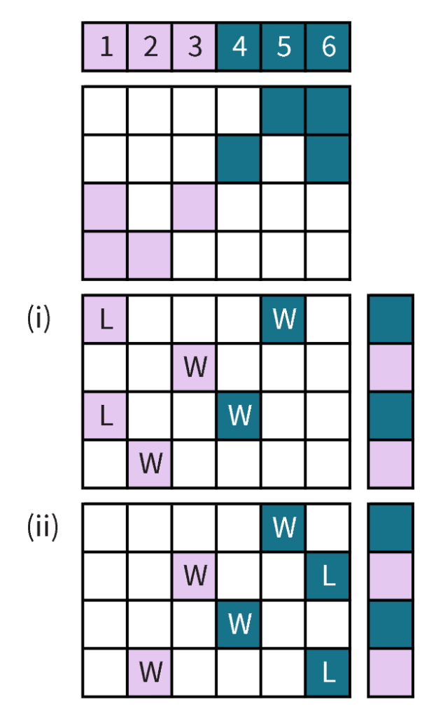 The tie-up on the right is for rising shafts and on the left for sinking shafts. In both cases, the treadling marked (i) will put the light pink layer, layer one, on the face of the cloth, while the treadling marked (ii) will put the teal layer, layer two, on the face of the cloth.